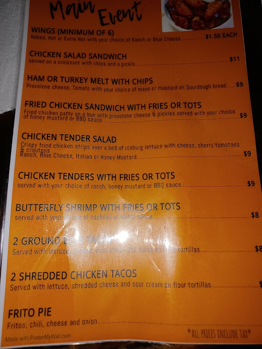 The menu’s approachable choices complement the laid-back vibe, making it a good spot for anytime snacking or a casual meal with drinks. Whether stopping in for a quick bite during a sporting event or settling in for an evening with live music and good company, the selections provide a simple and familiar foundation that matches the environment.